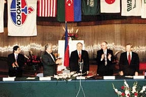 Above: Dan Ulduzu and Ashrafi Contract (l-r): Toshiro Tsunozaki, Japanese Embassy in Moscow; Jan Kalicki, U.S. Dept. of Commerce; Heydar Aliyev, President of Azerbaijan; T. Don Stacy, Chairman & President of Amoco Eurasia; and Marty Miller, Vice President of Unocal.